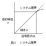 目的特性を縦軸に取り、目的特性のレベルの上下に関与する、操作容易な設計要素あるいは工程要素を信号因子とし横軸に取り、図1のような関係が得られるならば、その直線範囲内で各種グレードの品物を随時作ることができる。即ちそのシステムの限界調査が必要なのである(図2)。ここで信号因子のβを上げることができれば、限界の向上が可能となる。それ以上の要求がいつ頃出て来るかを見極めて、次のシステムの開発に移れば手戻りはない。