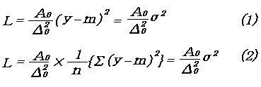 一般には下図のように品質は連続のはずである。設計値mのとき最も良好で、特性値か大きくなっても小さくなっても、目標値mのからの距離に比例して悪さが増大する。しかし、ある値を超えるまでは直接的なトラブルとはならない。その値を機能限界と呼び、⊿0で表す。機能限界を超えると大きな損害A0円が発生する。その手前までは当面上の損害は見えないが、潜在的損害か生じているのであって決してゼロではない。それを式で表せば式(1)のようである。式(1)は1個の品物についてのばらつきの経済的評価であるが、集団で考えるなら式(2)のようになる。この関係を損失関数と呼ぶ。