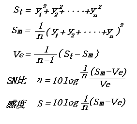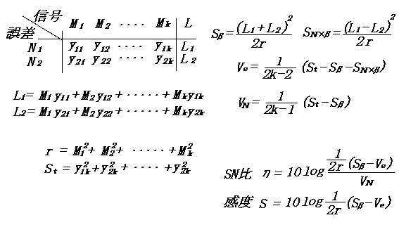 この関係に基づいてSN比を求めるためのデータの作り方およびSN比の計算は次のようである。ここに示した動特性のSN比は最も簡単な場合いについてのもので、信号の与え方、誤差の与え方などでSN比の計算式が変わる。特に商品と工程の並行開発を行うとき、信号は2信号となるので注意されたい。技術開発の具体的な実験の進め方はパラメータ設計と同じ方法を用いる。