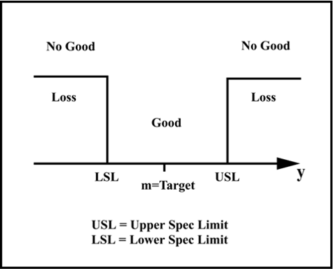 Traditional quality assessment represented by inspection evaluates whether requirements are met. It is a Go/No-Go approach and is more of an accounting mentality. Taguchi's loss function evaluates the loss in a continuous fashion. For example, the differences in evaluating a characteristic with its target value m are as follows.